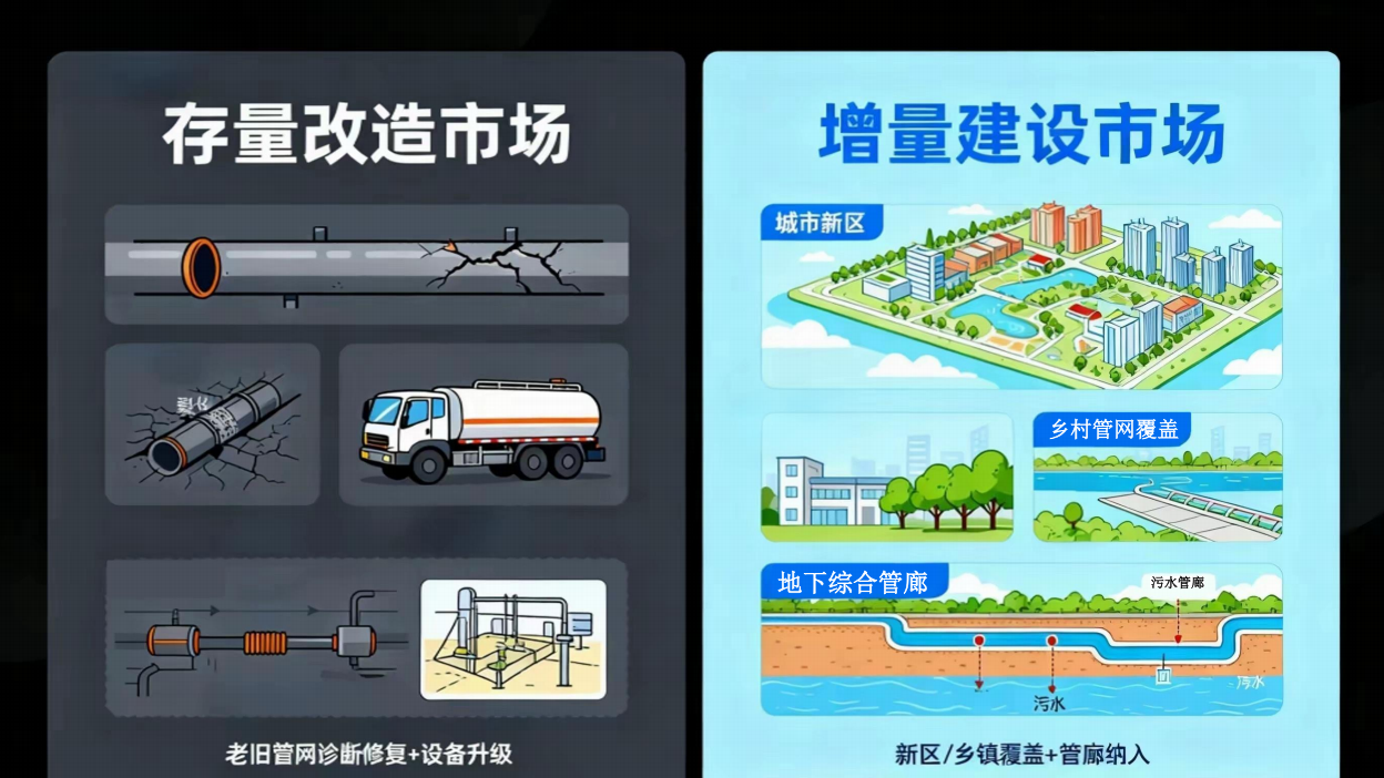 增量建设市场-主要集中在城市新区、城乡结合部以及此前覆盖不足的县城和乡镇,实现“管网全覆盖”目标。此外,地下综合管廊的建设也会为污水管网的纳入创造新的空间。