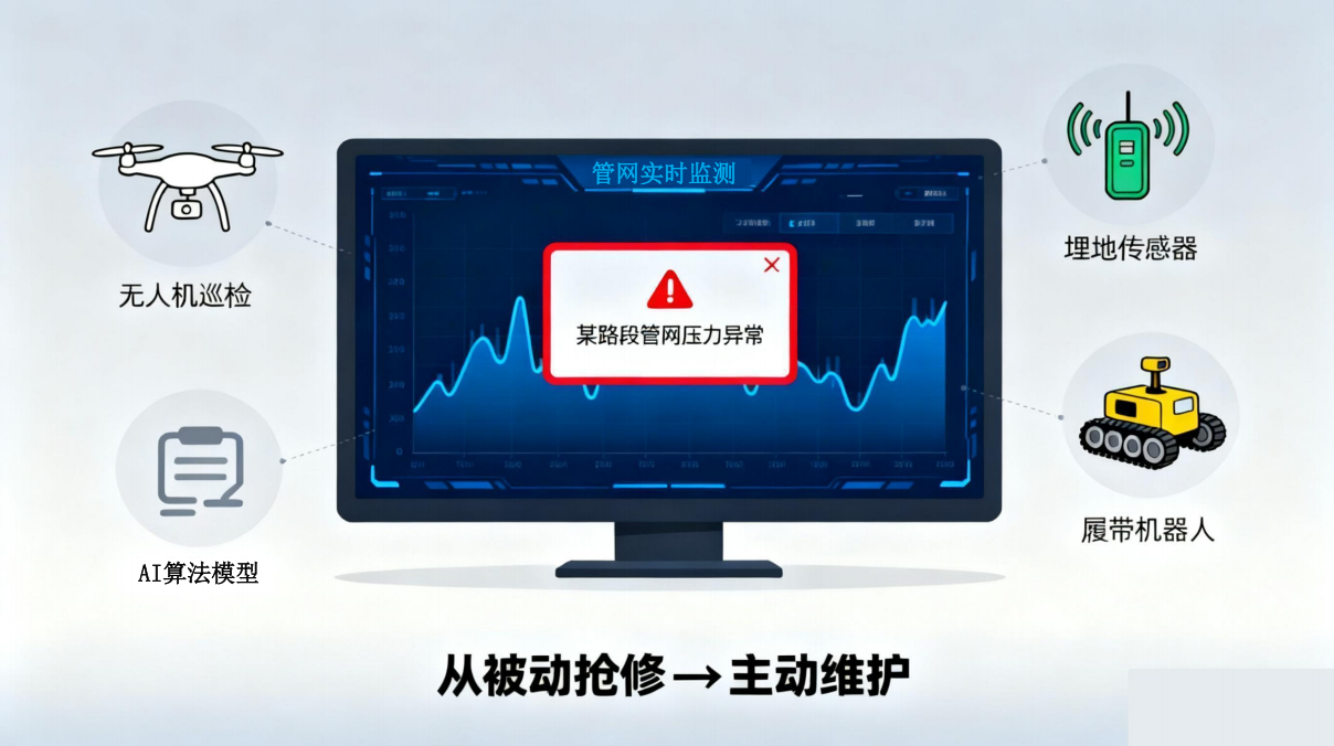 智能化运维管理-智慧水务平台的需求将激增,包括利用物联网传感器、无人机、机器人、大数据和AI模型对管网流量、水质、液位、有害气体等进行实时监测、预警和智能调度,实现从“被动抢修”到“主动维护”的转变。